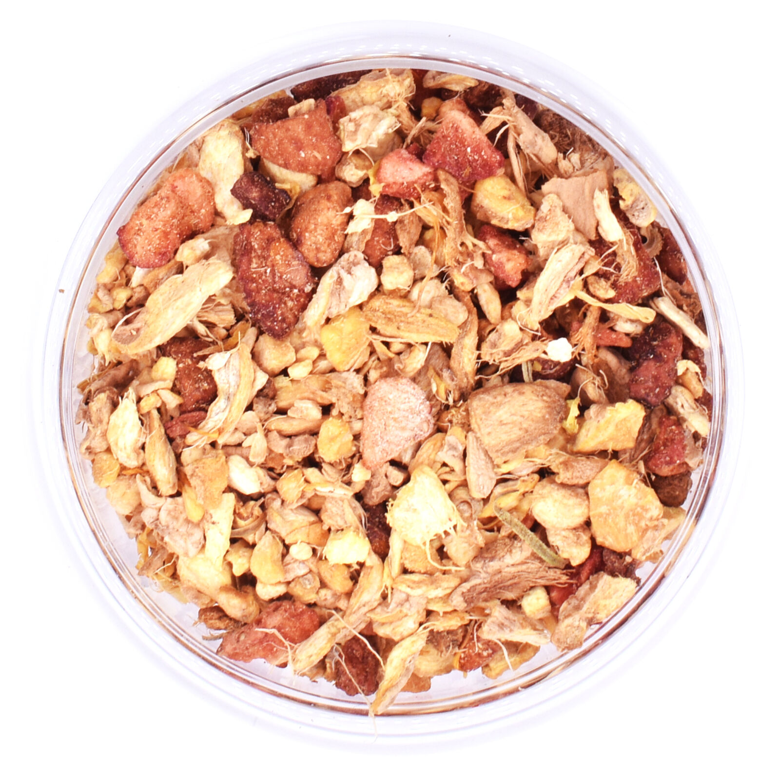 Ez a gyógytea a gyömbér melegítő erejét, az eper gyümölcsös frissességét és a körömvirág