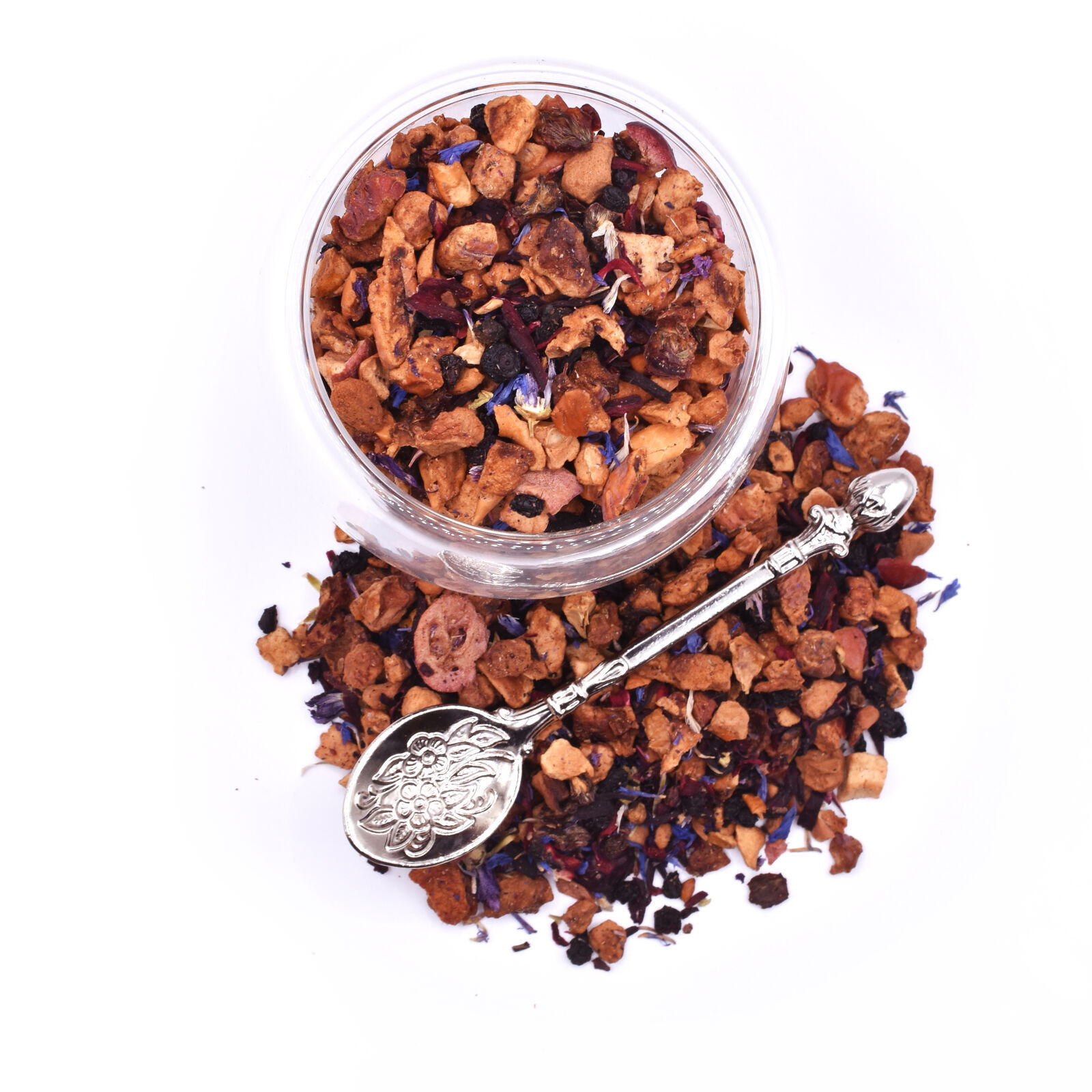 Ez a teakeverék a vörös és fekete áfonya gazdag, telt ízvilágát ötvözi az alma lágy édességével, a hibiszkusz és csipkebogyó frissítő savasságával, valamint a mályva és kék búzavirág finom virágos jegyeivel. A főzet mélybordó színe és illata az őszi erdők hangulatát idézi – minden kortyban ott rejlik a természet vad szépsége és a bogyós gyümölcsök zamata.