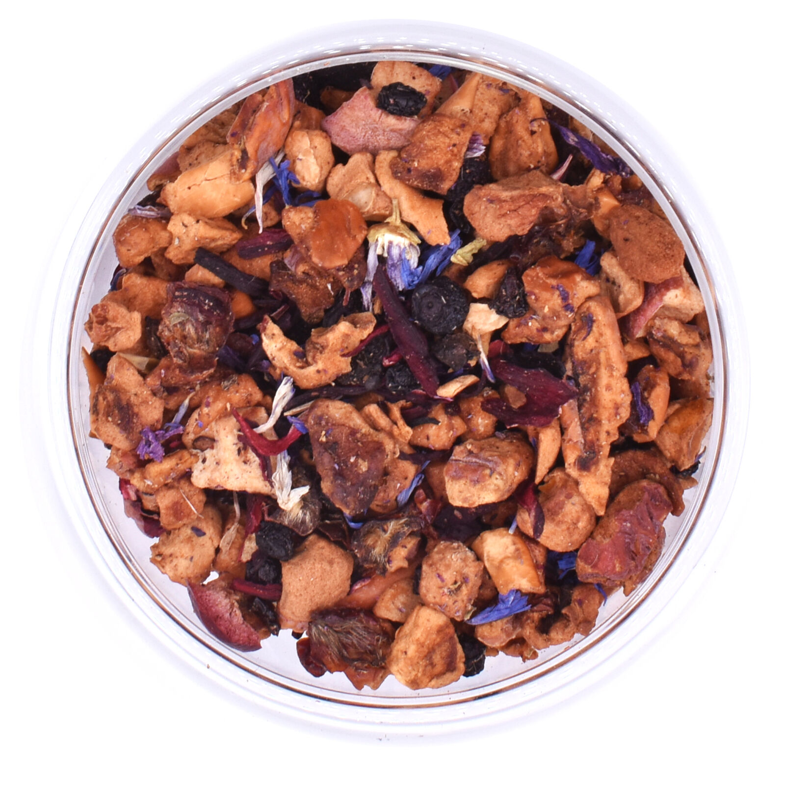 Összetétel: Kék és vörös áfonya szeletek, almadarabok, hibiszkuszvirág, csipkebogyóhéj, mályvavirág, kék búzavirág